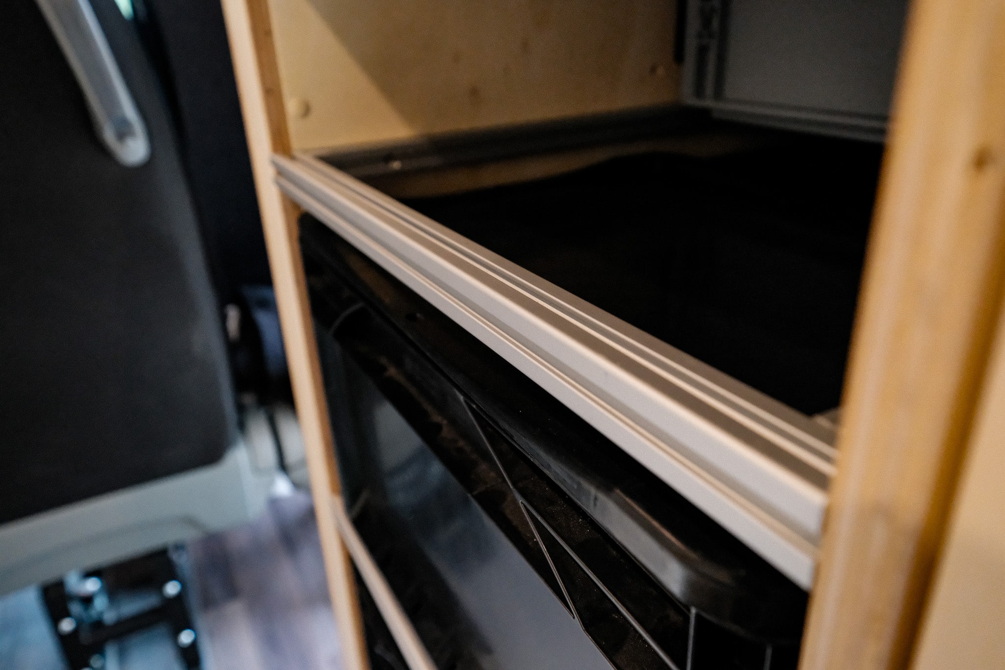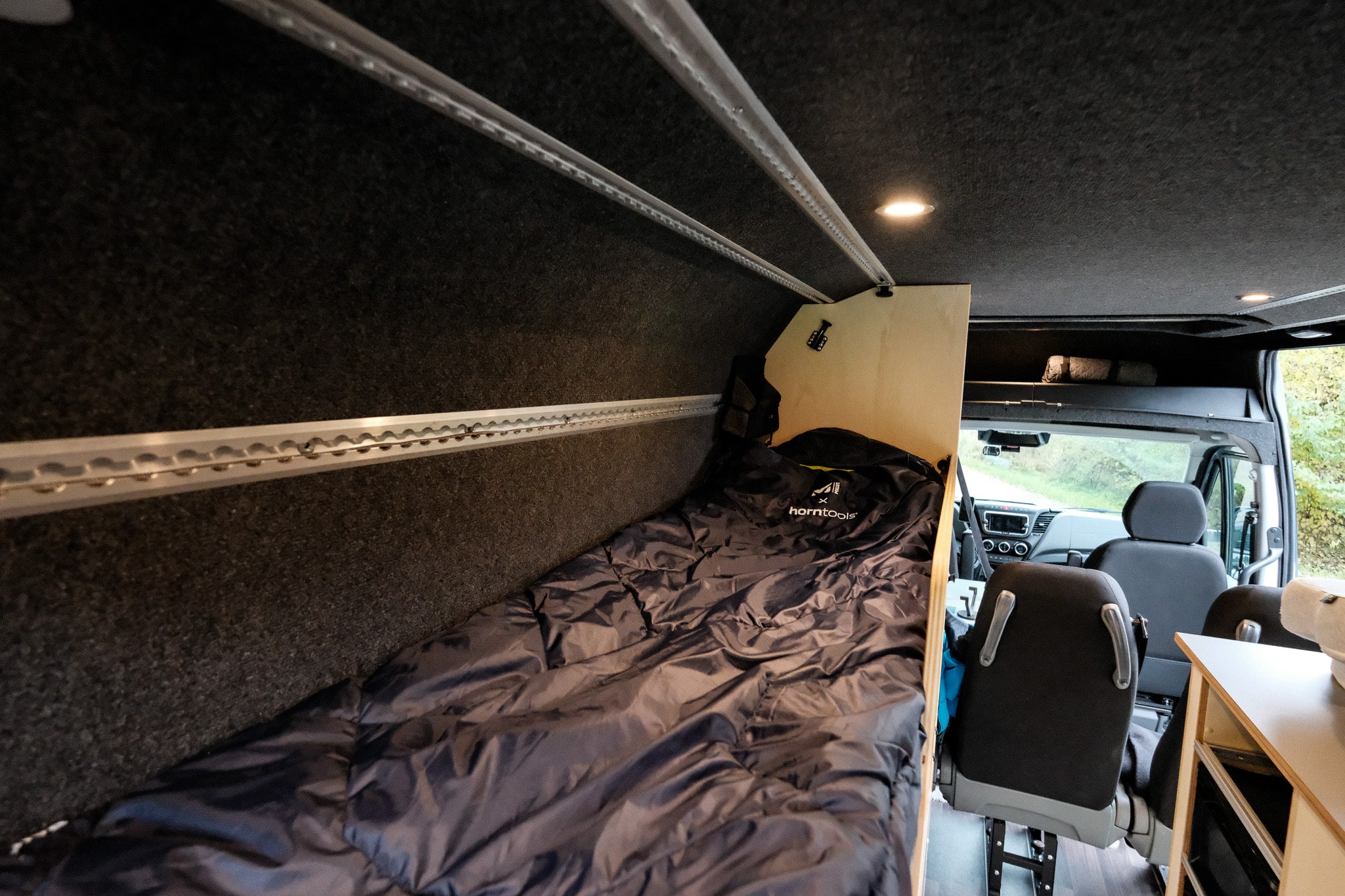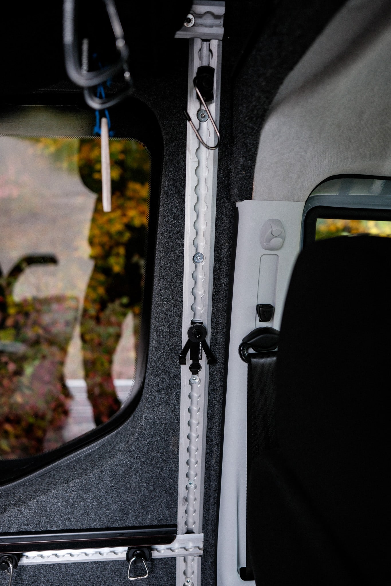 Der Innenraum des Daily Switch ist modular aufgebaut und kann je nach Bedarf angepasst werden. Dank eines Airlineschienensystems an Boden, Dach und Seitenwänden lassen sich verschiedene Module wie Betten, Küchenzeilen oder Stauraum flexibel installieren und verschieben. Die Wand- und Deckenverkleidung mit Schall- und Wärmedämmung sorgt für ein angenehmes Raumklima.