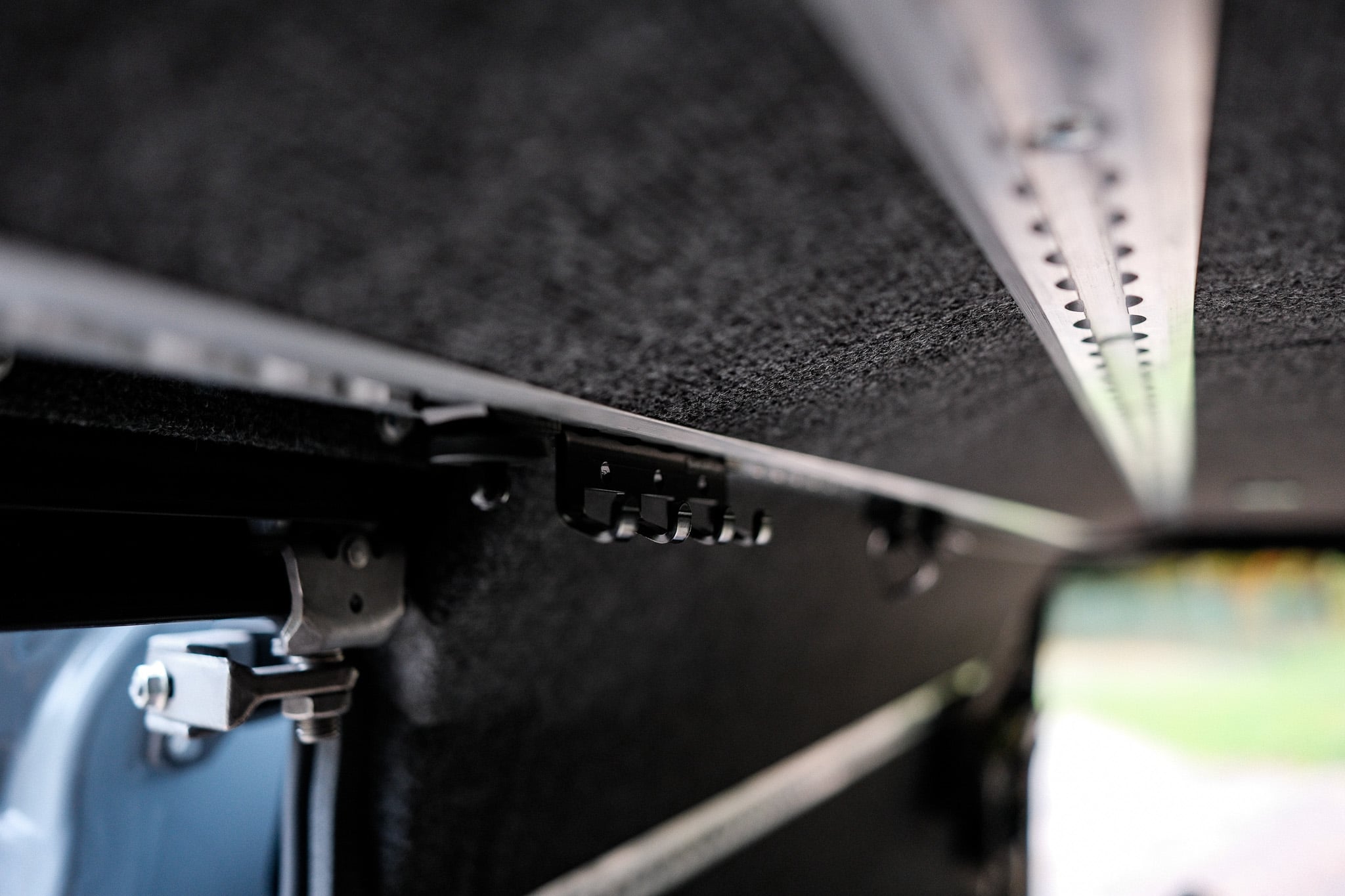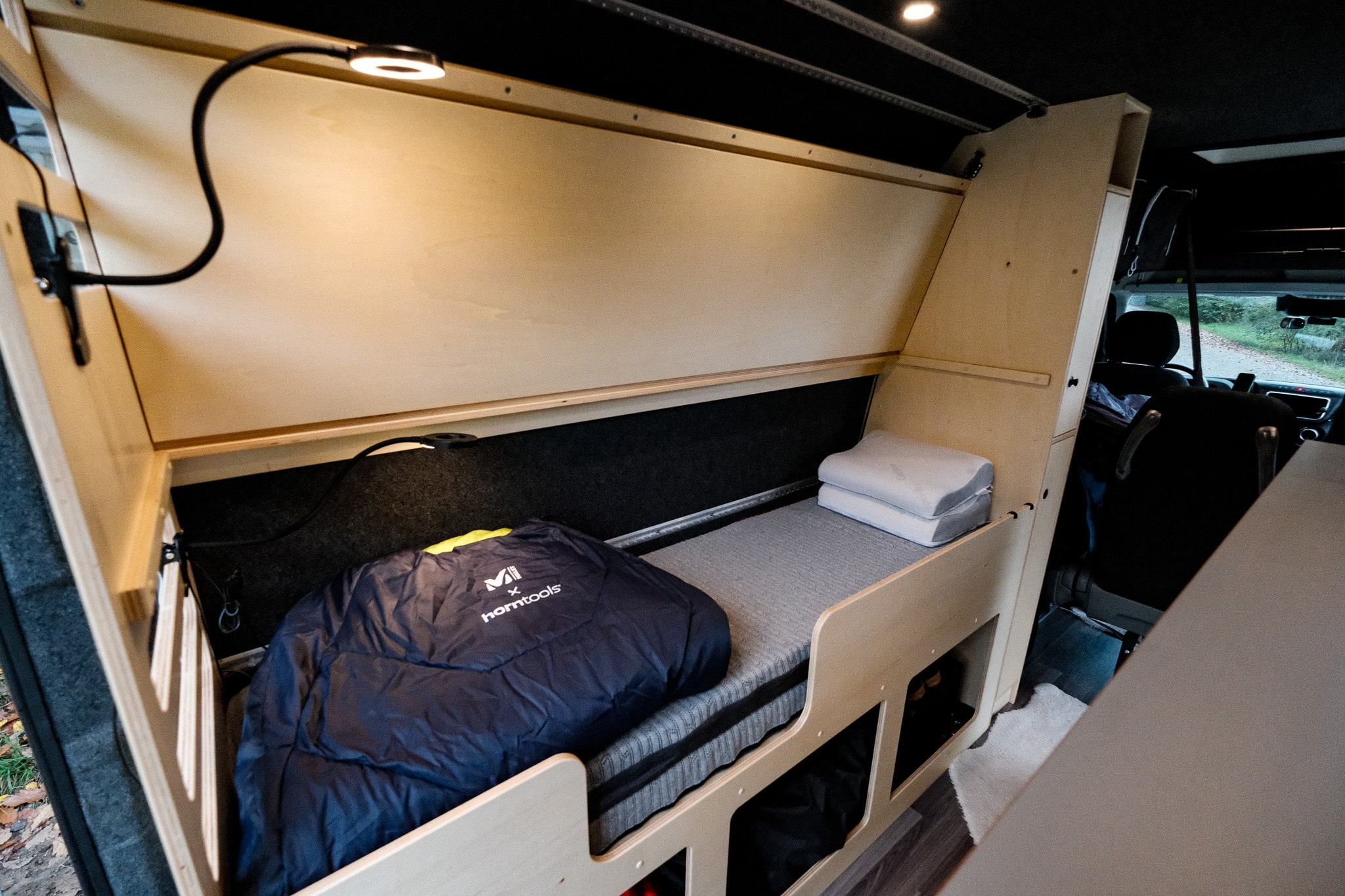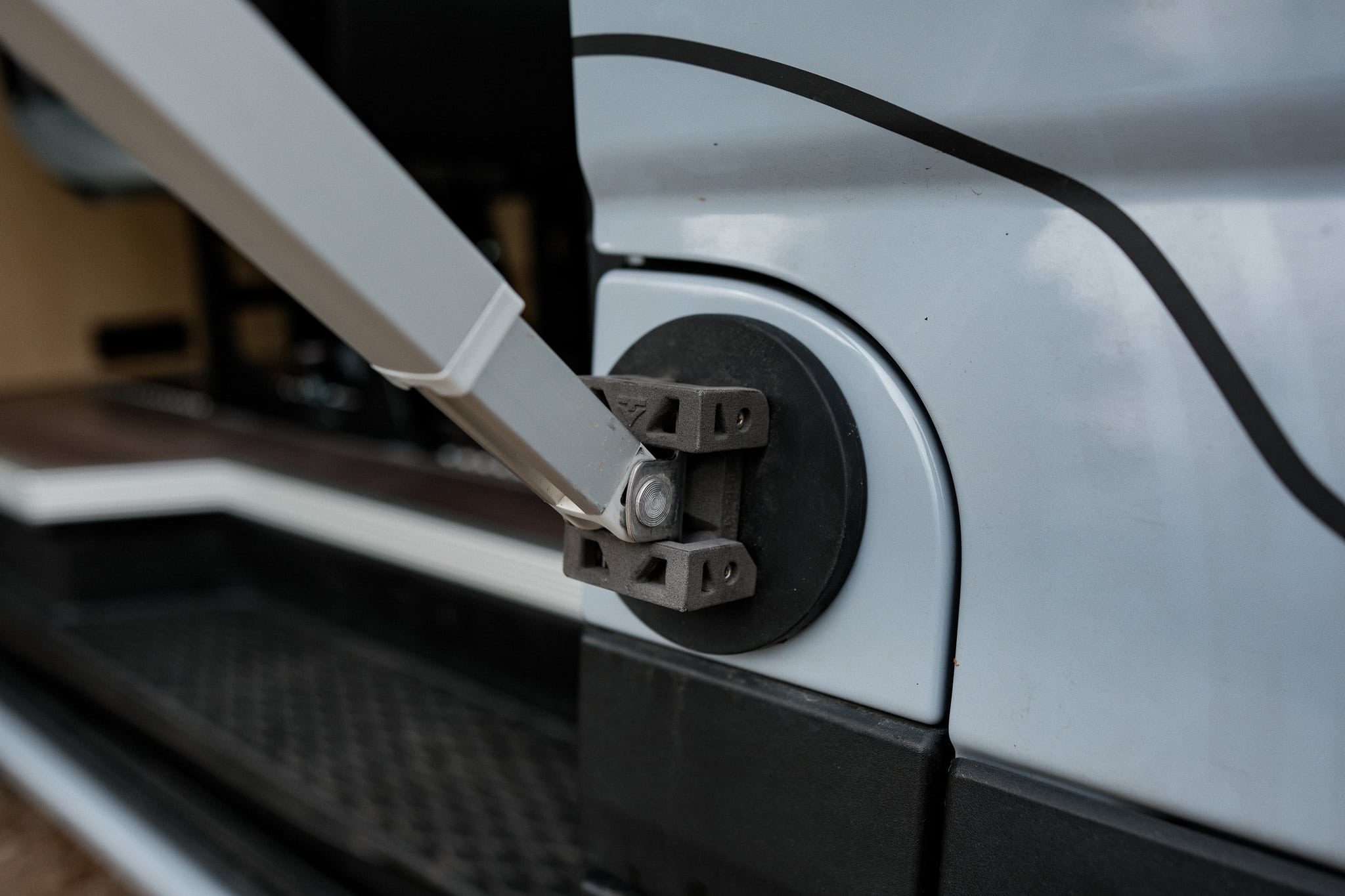 Das Herzstück des neuen Konzepts ist das integrierte Aufstelldach von Flexibu, das nicht nur für zusätzlichen Schlafraum sorgt, sondern auch mit einer stilvollen LED-Beleuchtung ausgestattet ist und zusätzlichen Raum im Fahrzeug bietet. Der Zugang erfolgt über eine hochwertige Leiter mit zusätzlichen Trittstufen, die einen komfortablen und sicheren Aufstieg ermöglichen – auch für Kinder.