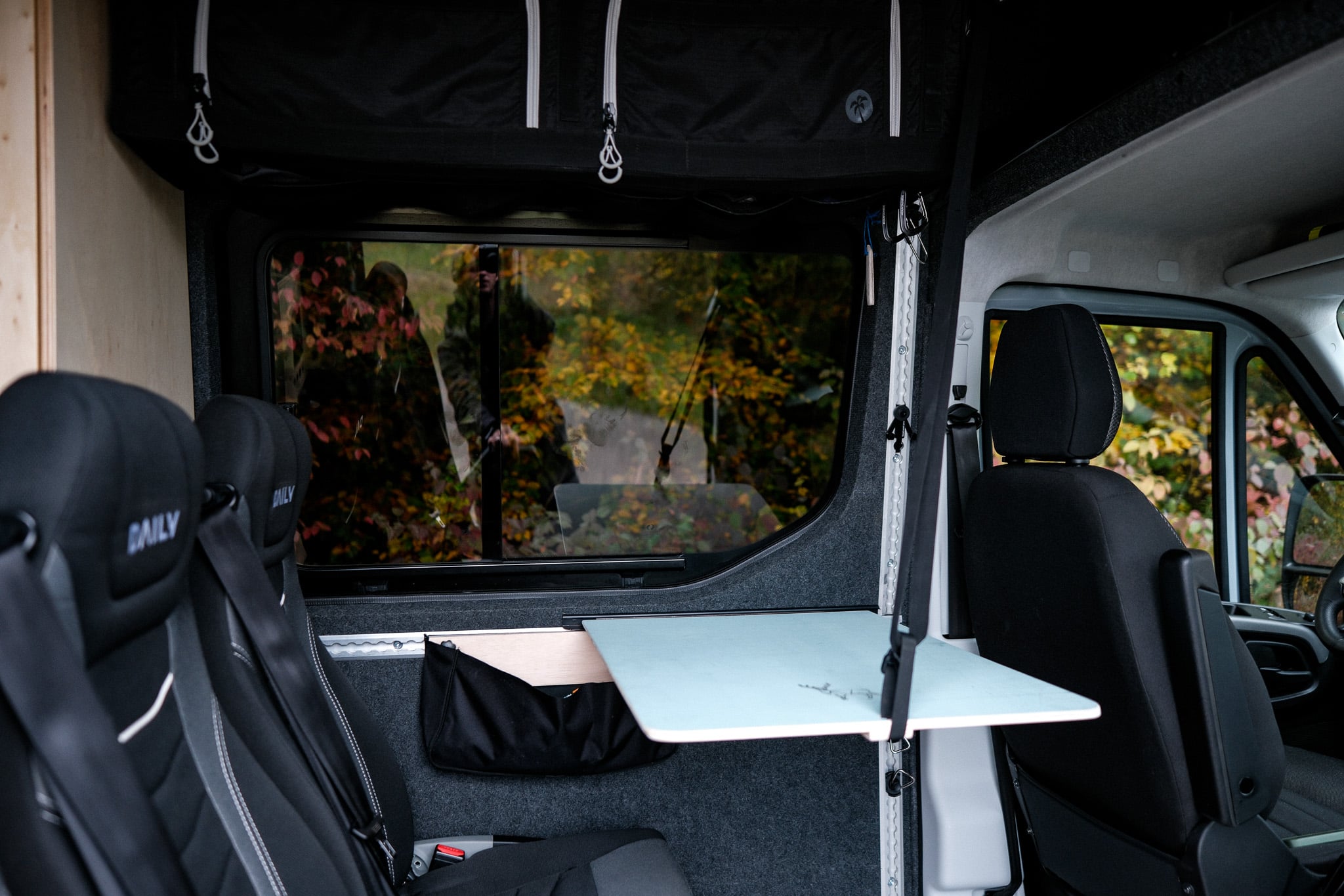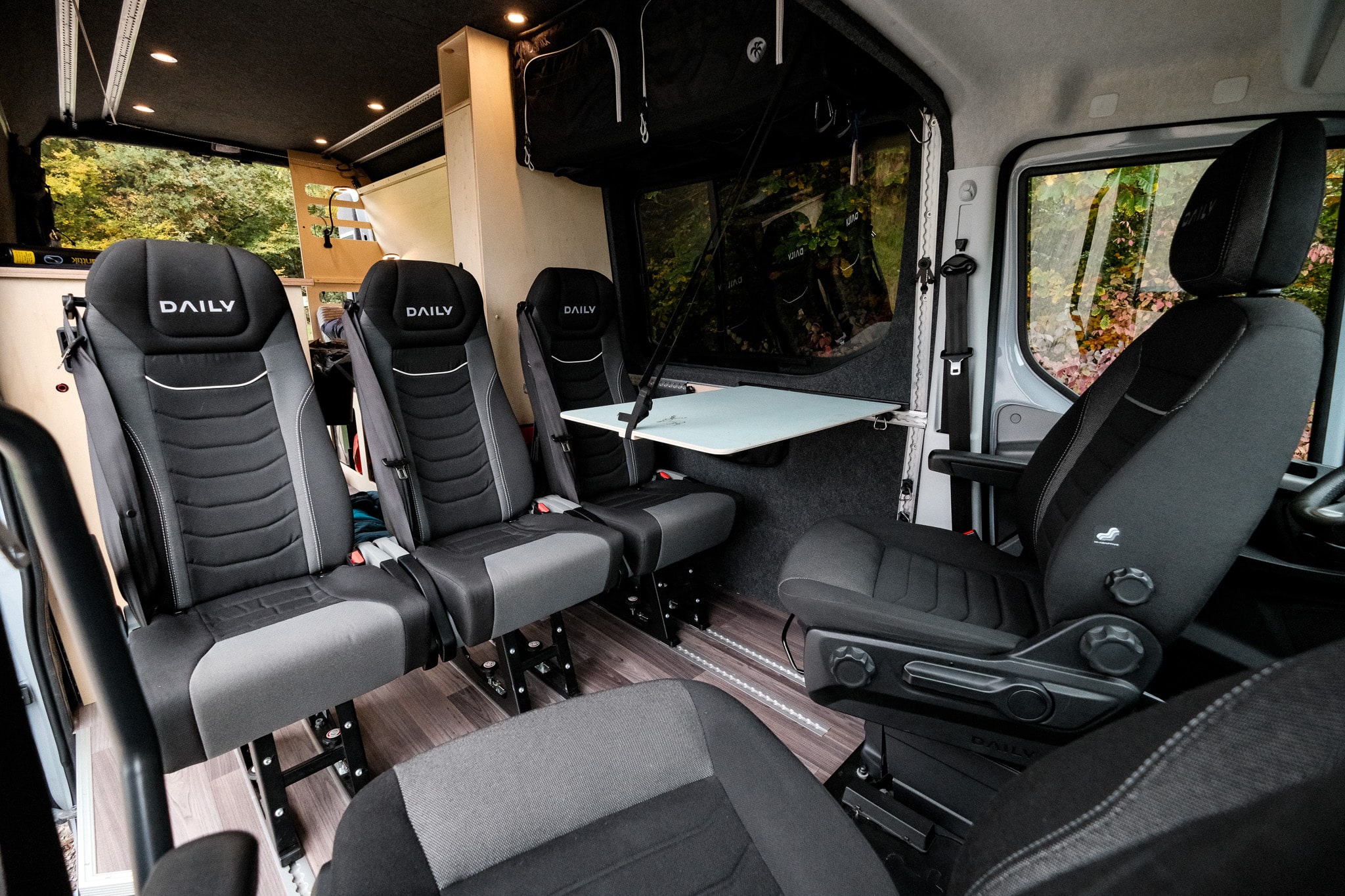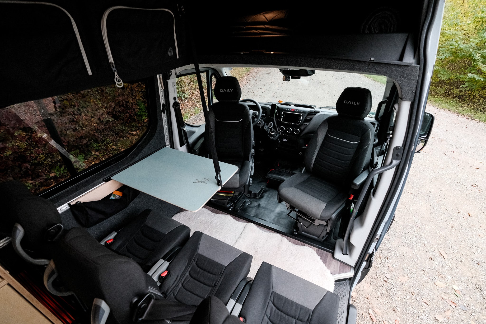 Im Innenraum wurde der Ausbau so angepasst, dass bis zu fünf Personen komfortabel mitfahren können – allesamt auf hochwertigen Einzelsitzen. Die drehbaren Vordersitze schaffen ein großzügiges Raumgefühl und verwandeln das Fahrzeug im Stand in eine gemütliche Sitzecke.
