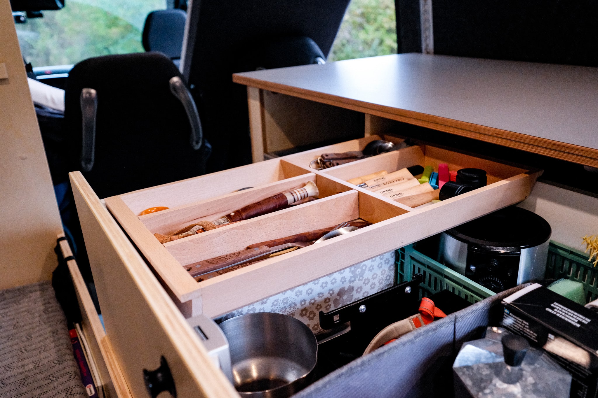 Die Heckküche bietet alle notwendigen Funktionen für die mobile Selbstversorgung, ergänzt durch weitere Schlafplätze, sodass eine fünfköpfige Familie bequem übernachten kann.