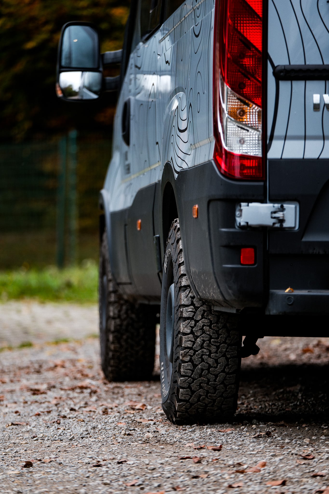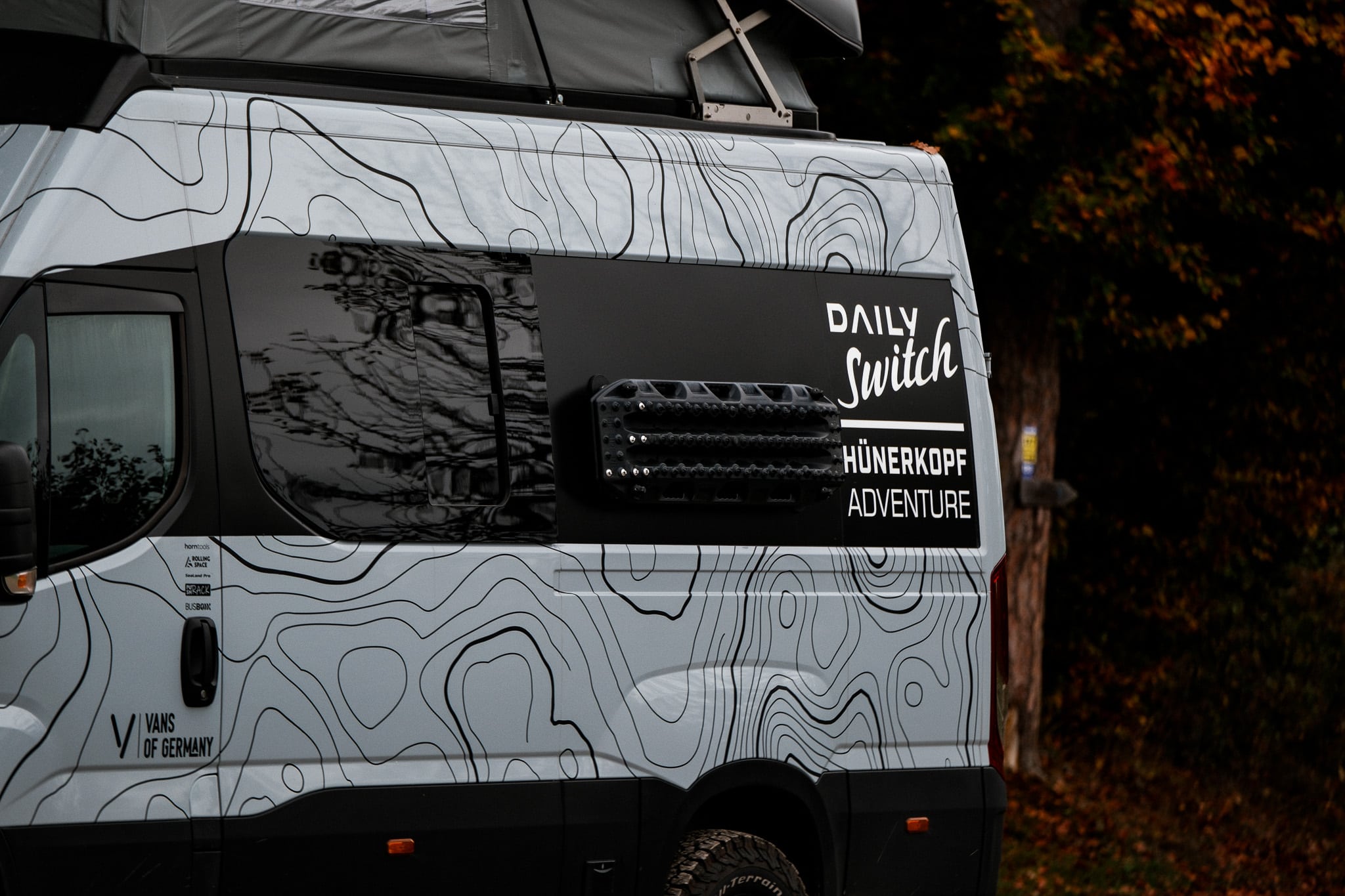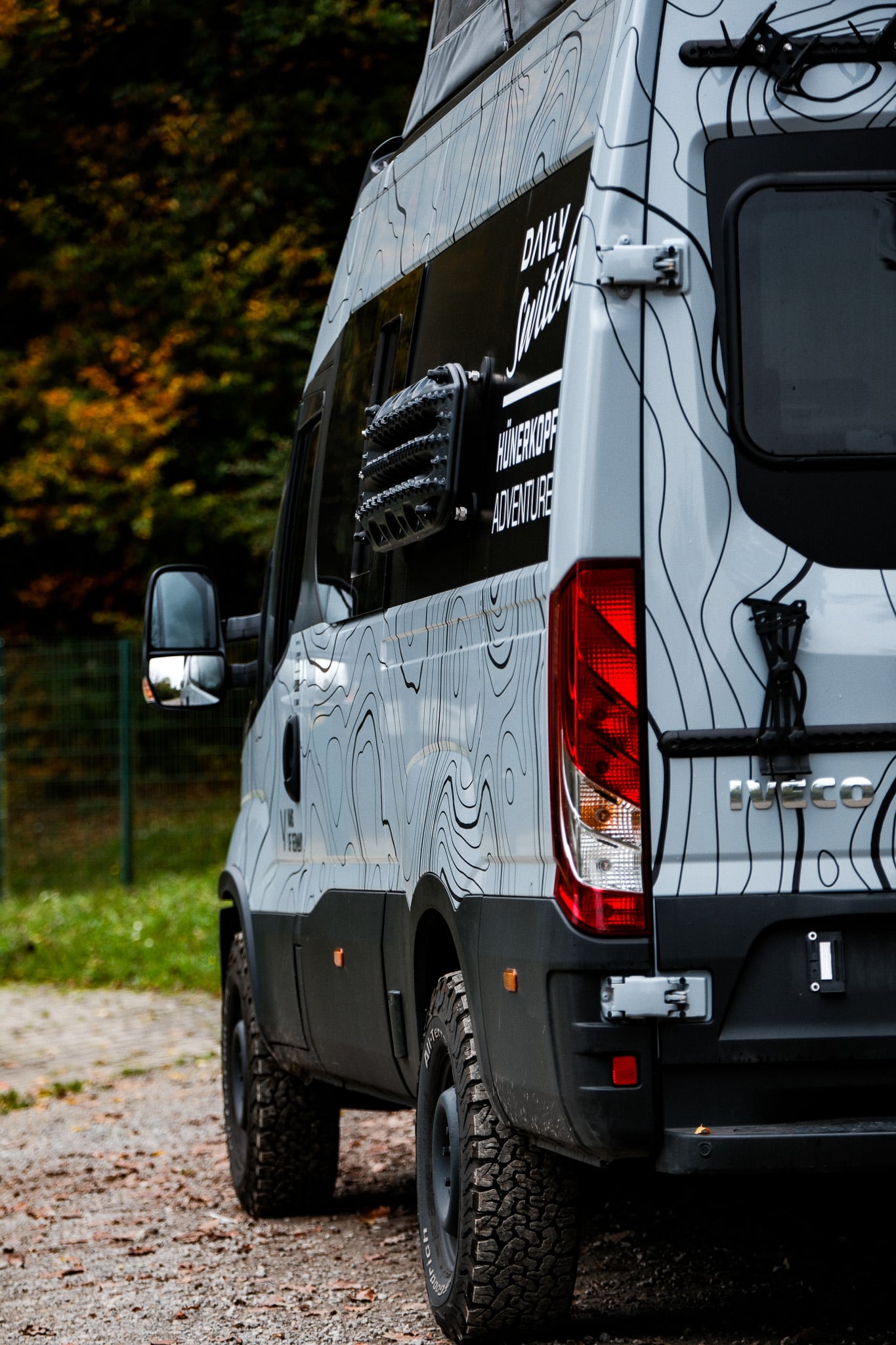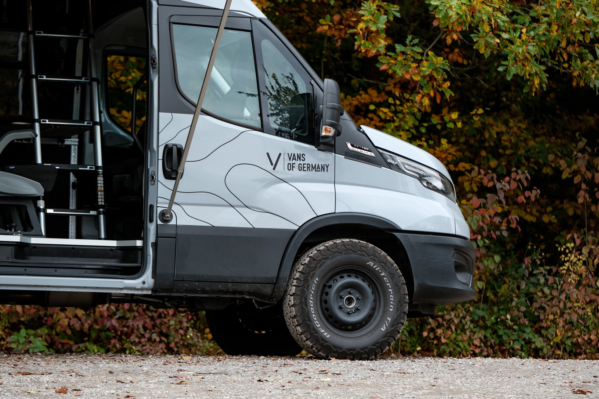 Um die Offroad-Fähigkeiten deutlich zu verbessern, wurde dem Daily ein neues Fahrwerk verbaut, das für 6,5 cm mehr Bodenfreiheit sorgt. Ergänzt wird das Setup durch Offroad-Reifen, die ihn auch auf unwegsamem Gelände sicher voranbringen. Für Situationen, in denen Traktion gefragt ist, kommen Sandbleche zum Einsatz, die mithilfe von Magnethaltern der Firma Tactic Vans direkt an der Karosserie befestigt werden – schnell zugänglich und praktisch verstaut.