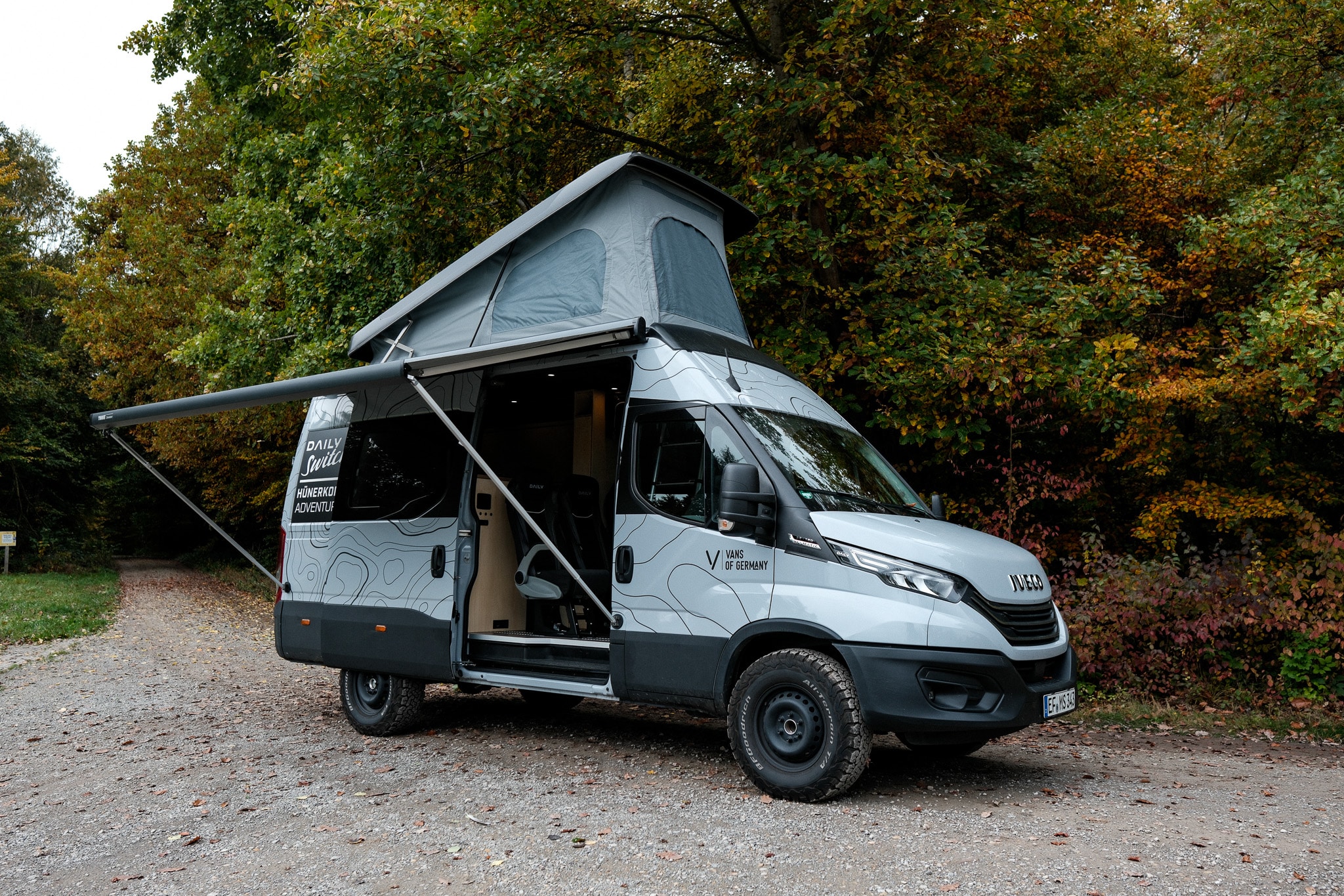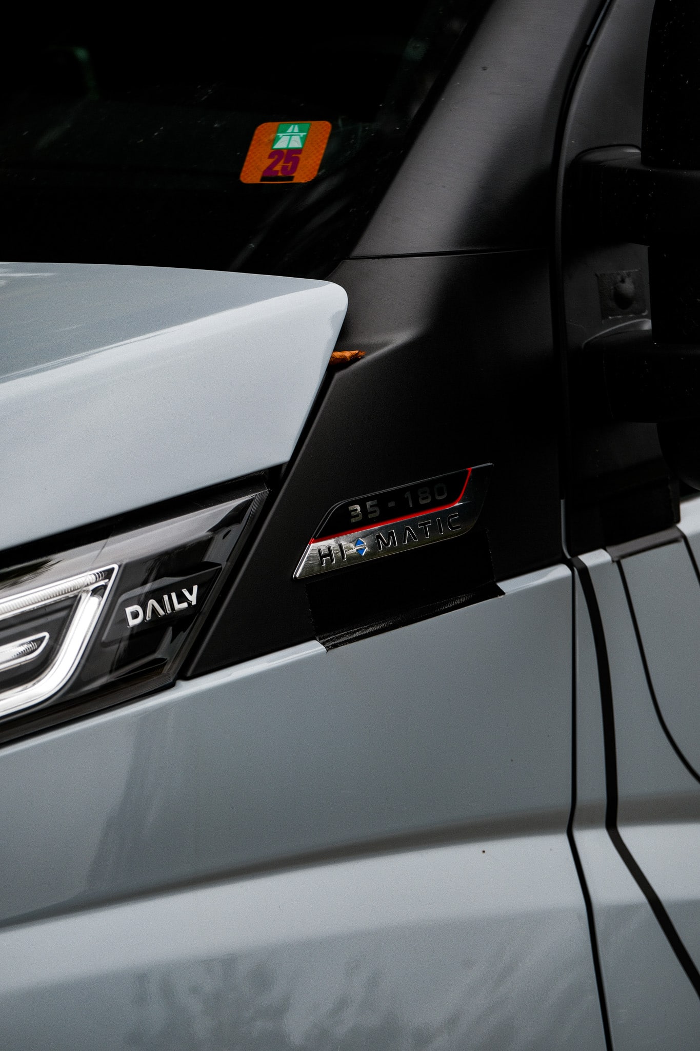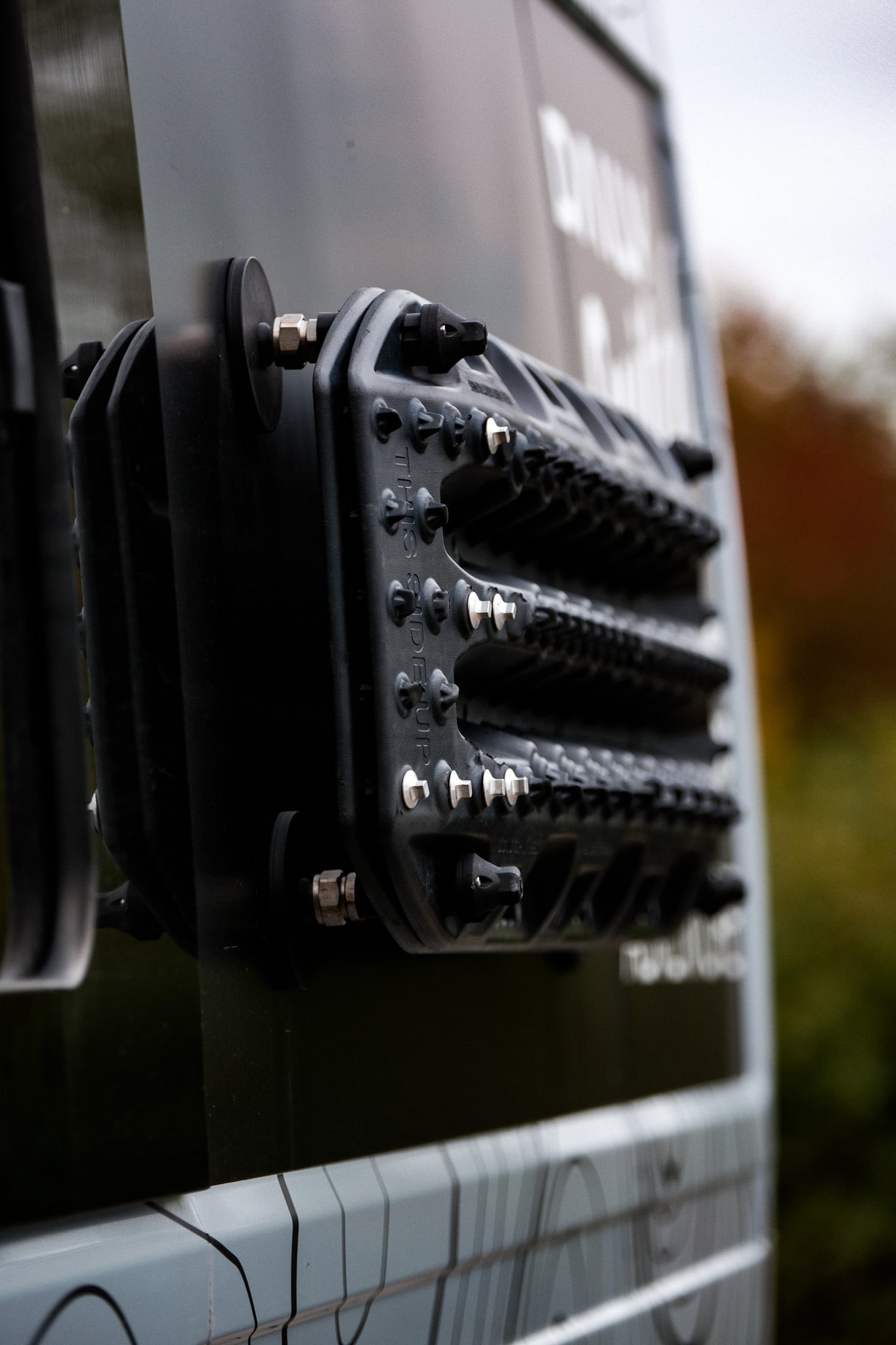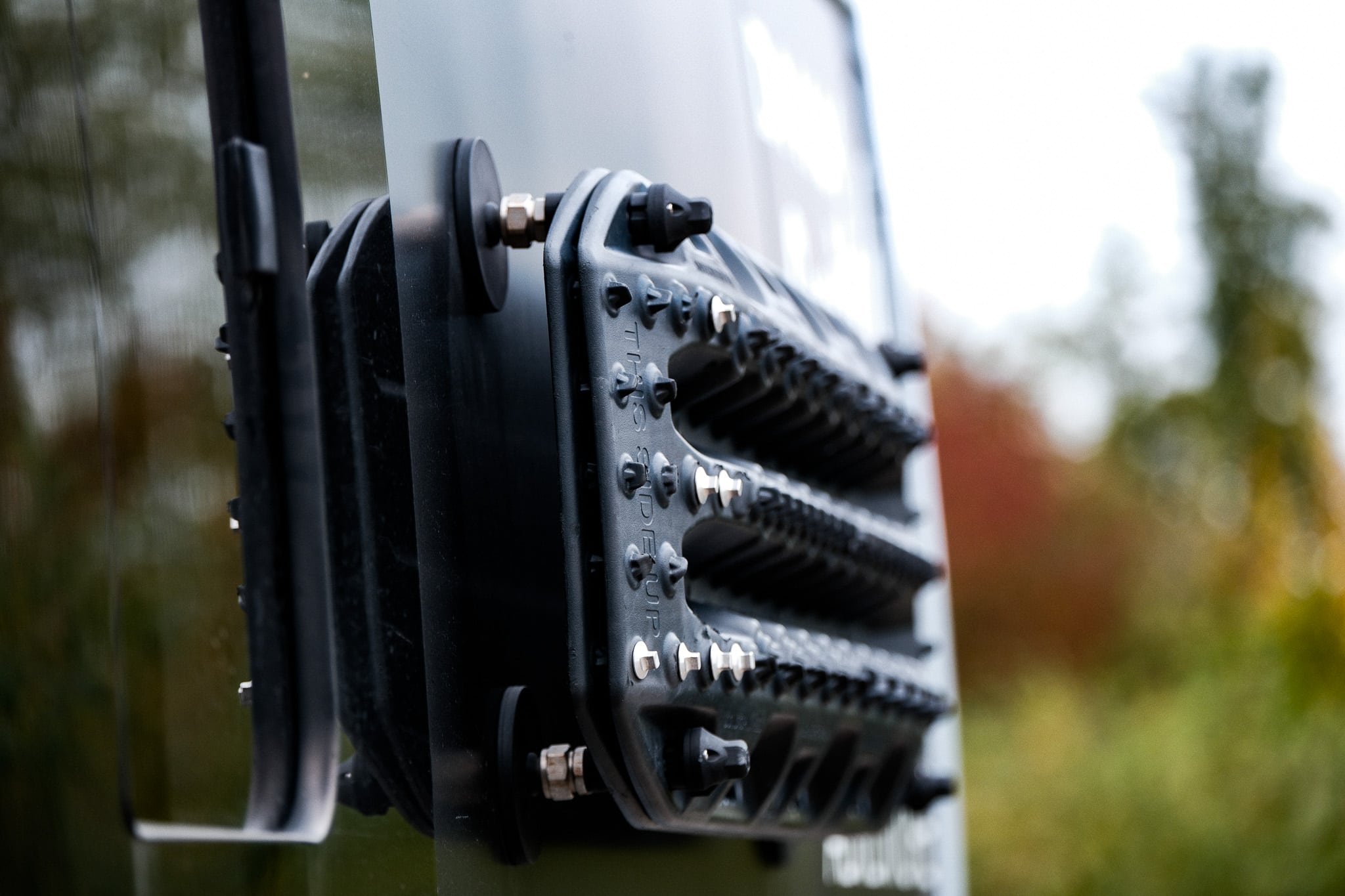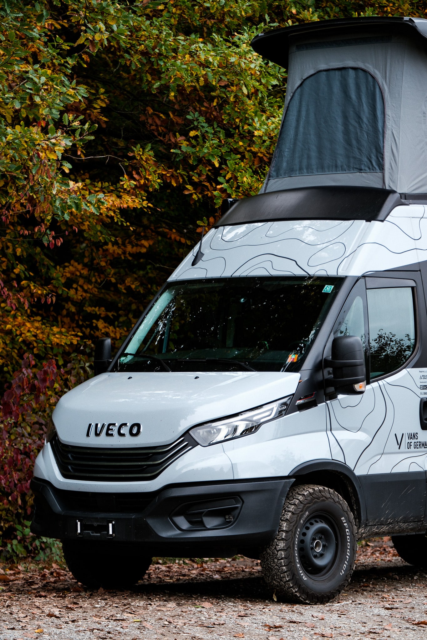 Um die Offroad-Fähigkeiten deutlich zu verbessern, wurde dem Daily ein neues Fahrwerk verbaut, das für 6,5 cm mehr Bodenfreiheit sorgt. Ergänzt wird das Setup durch Offroad-Reifen, die ihn auch auf unwegsamem Gelände sicher voranbringen. Für Situationen, in denen Traktion gefragt ist, kommen Sandbleche zum Einsatz, die mithilfe von Magnethaltern der Firma Tactic Vans direkt an der Karosserie befestigt werden – schnell zugänglich und praktisch verstaut.