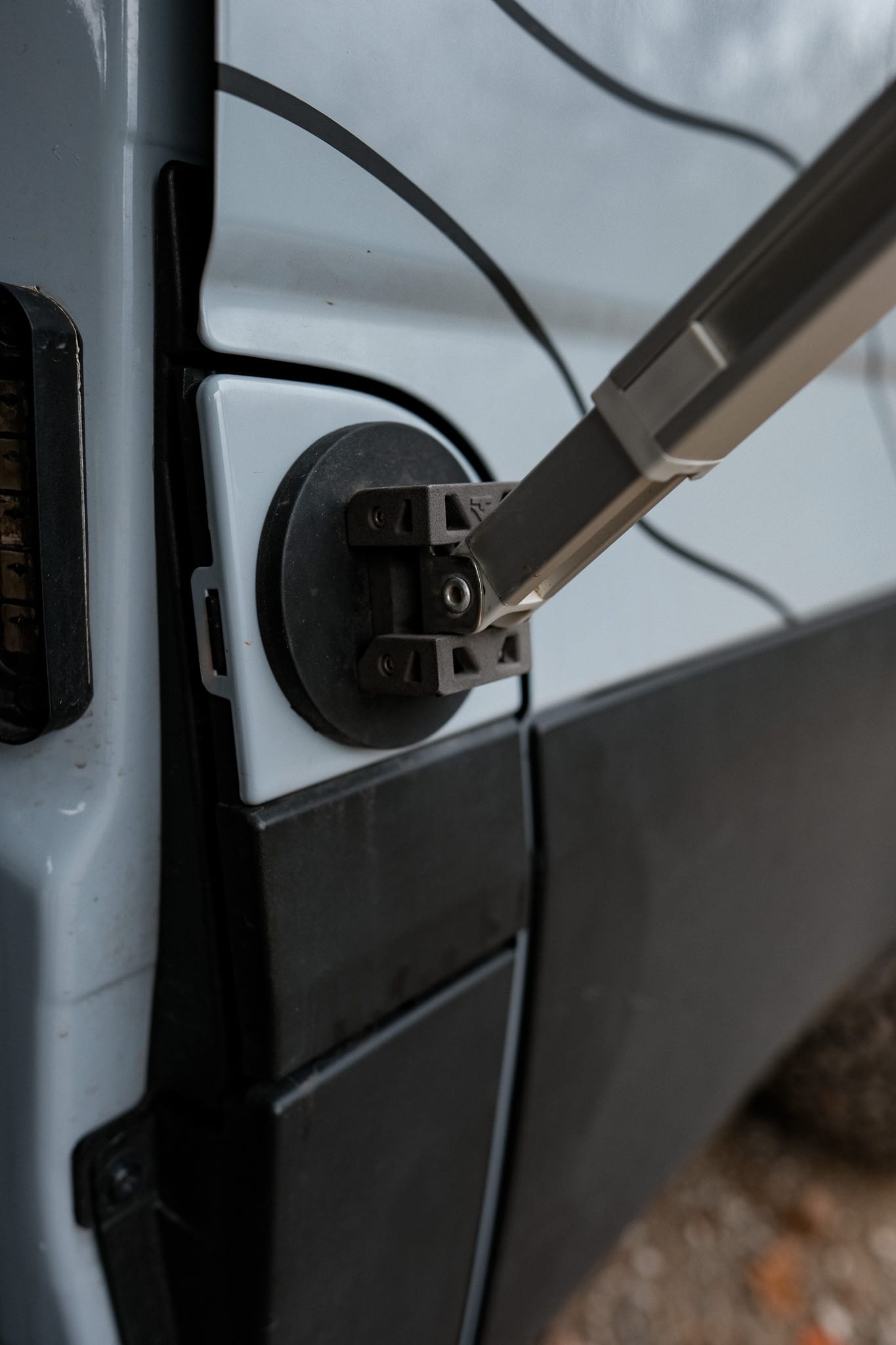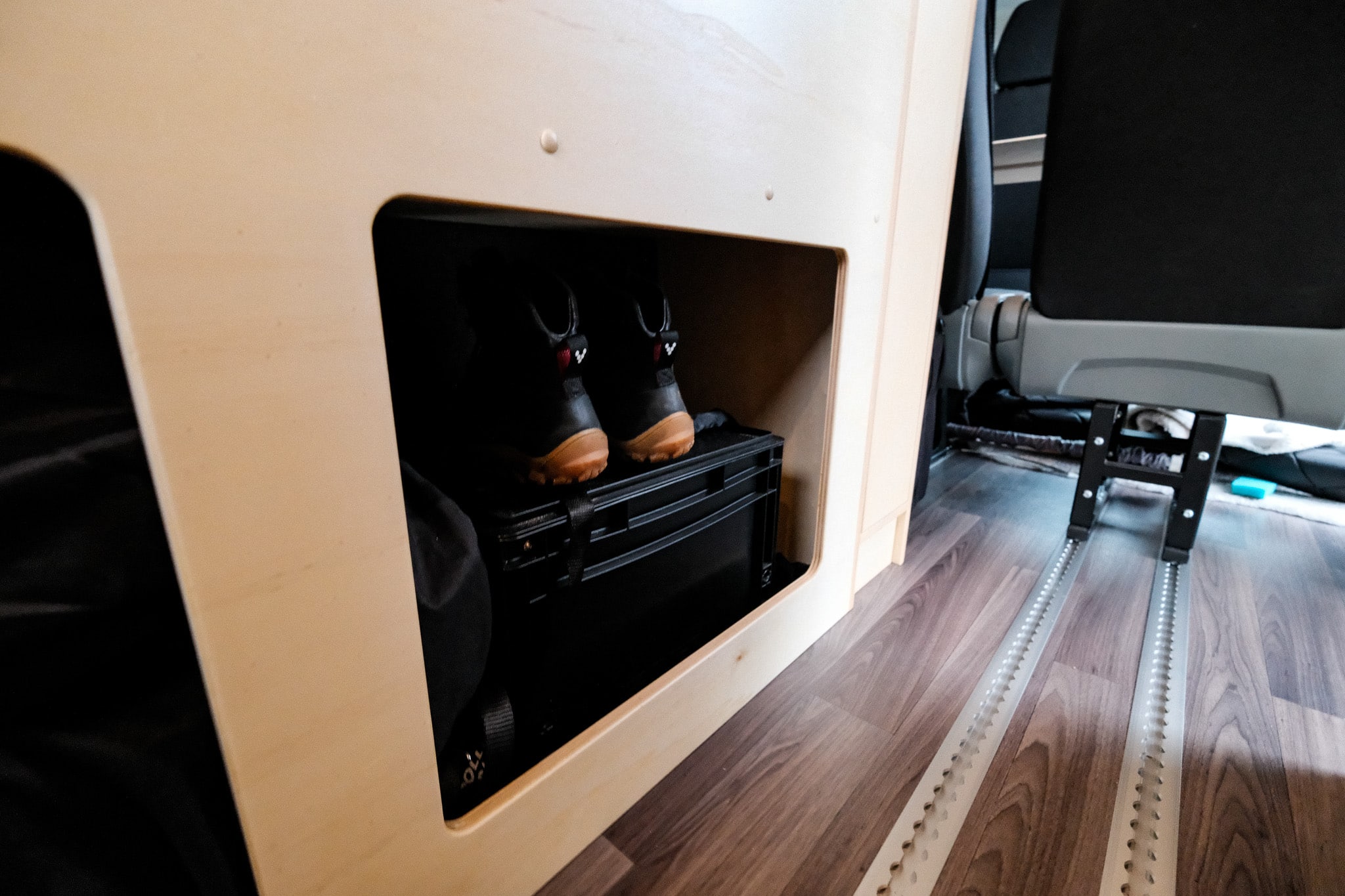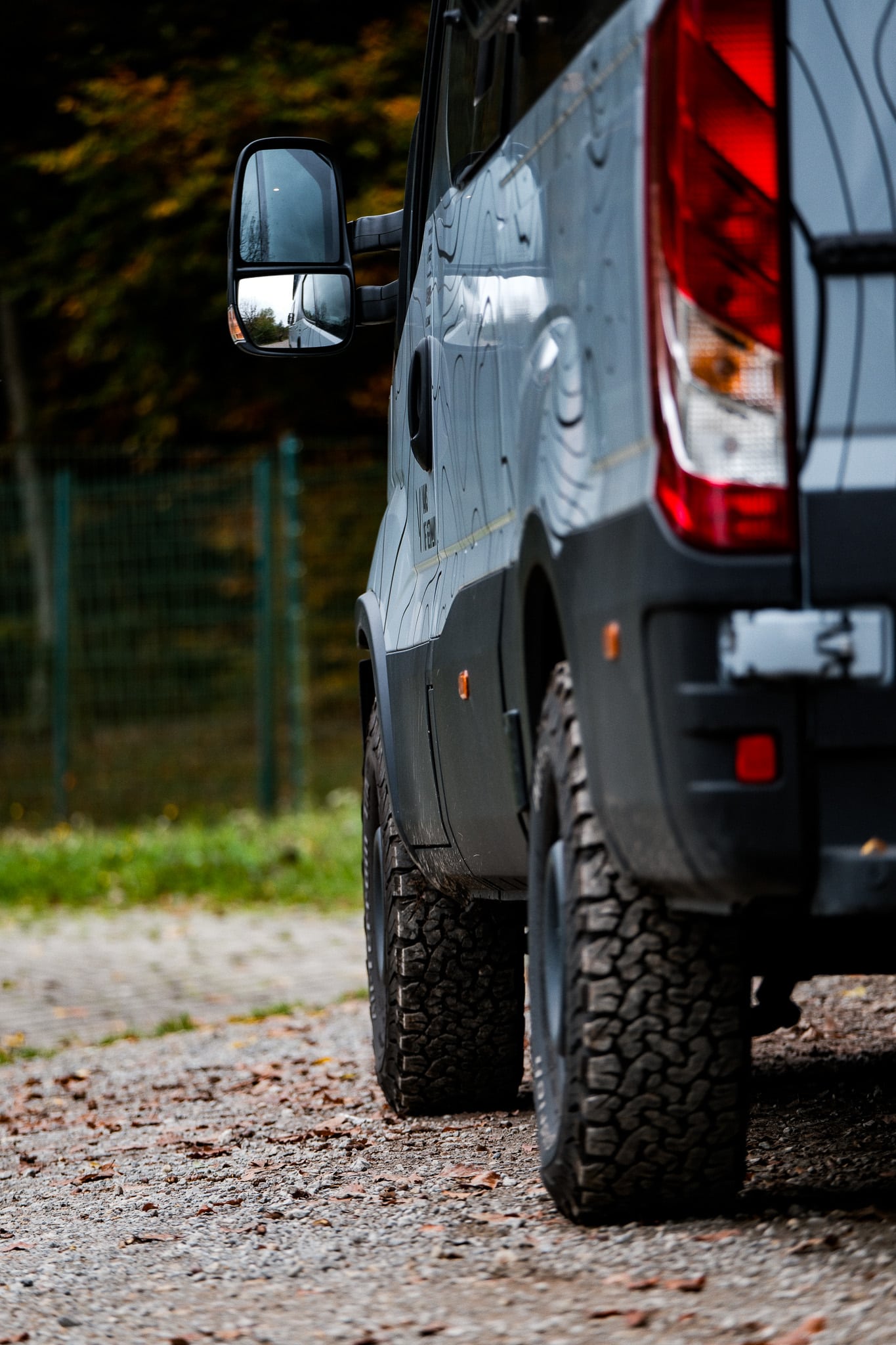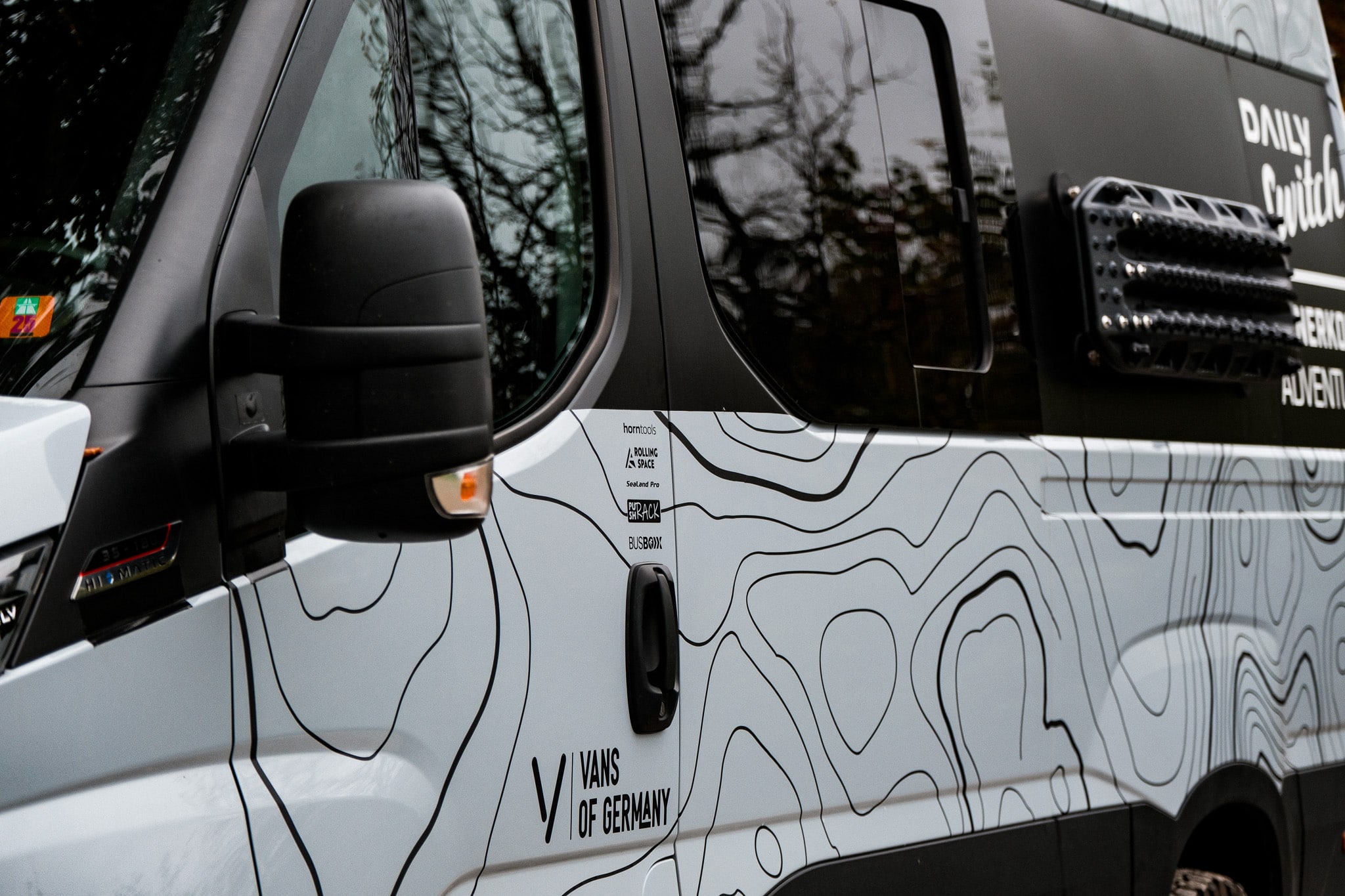 Um die Offroad-Fähigkeiten deutlich zu verbessern, wurde dem Daily ein neues Fahrwerk verbaut, das für 6,5 cm mehr Bodenfreiheit sorgt. Ergänzt wird das Setup durch Offroad-Reifen, die ihn auch auf unwegsamem Gelände sicher voranbringen. Für Situationen, in denen Traktion gefragt ist, kommen Sandbleche zum Einsatz, die mithilfe von Magnethaltern der Firma Tactic Vans direkt an der Karosserie befestigt werden – schnell zugänglich und praktisch verstaut.